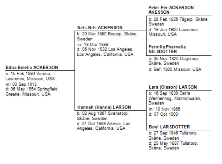 My grandmother Edna was the oldest child in the family of Nels Ackerson and Hannah Larson. Nels immigrated from Sweden in 1871 with his parents and siblings. They settled in the small Swedish community of Globe, Missouri, outside of Verona in Lawrence County.